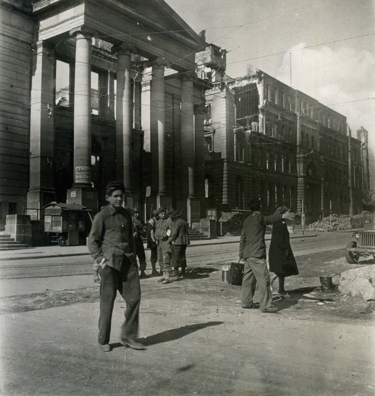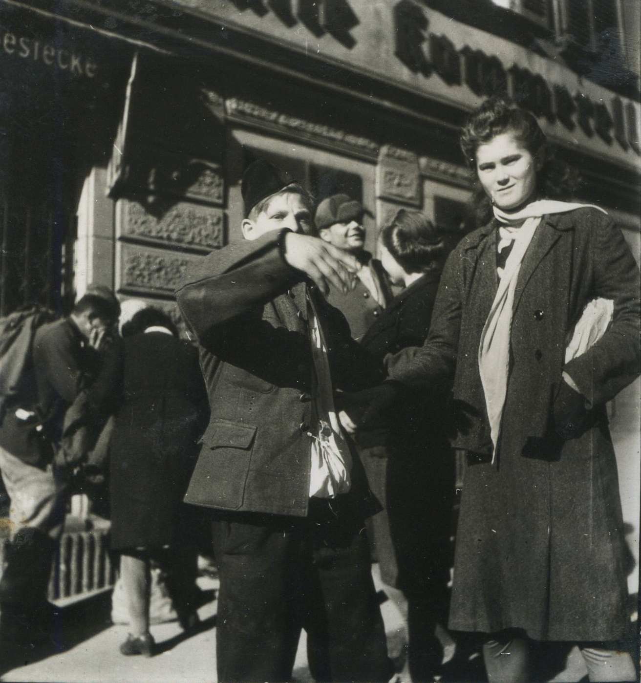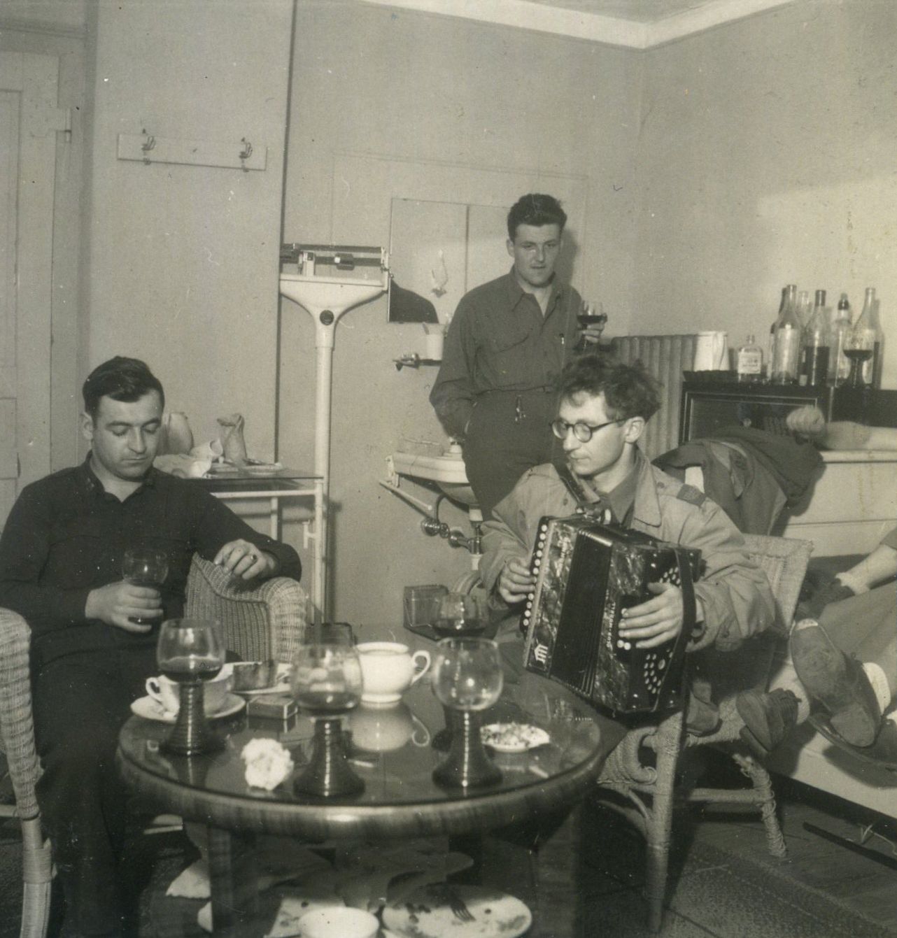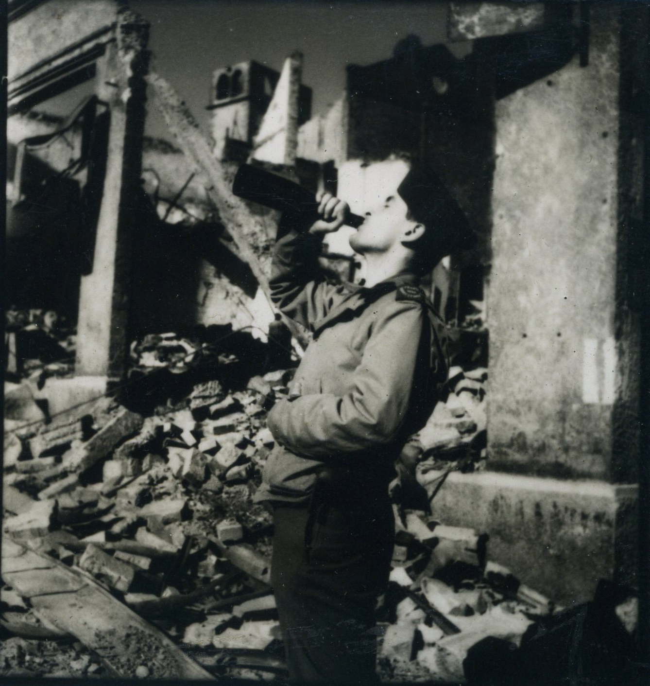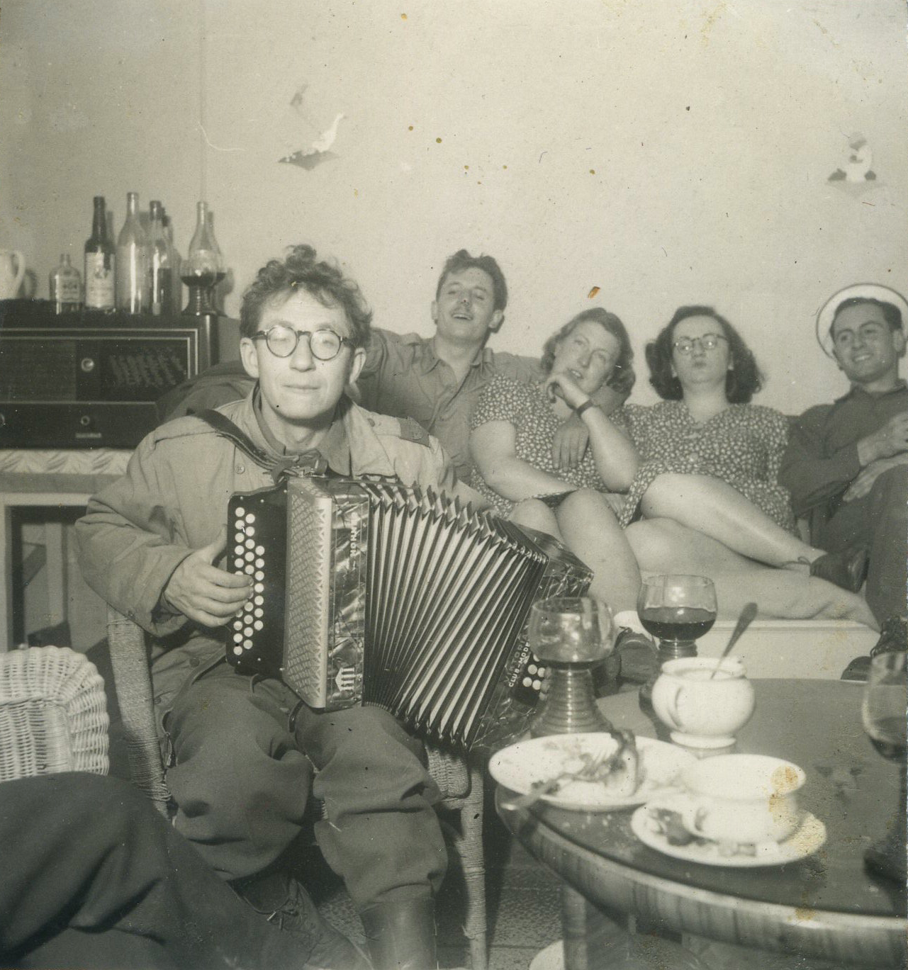 The most moving images of the collection are the last — Pierre's friends are partying because the war is over. Les images les plus émouvantes sont peut-être les dernières – les amis de Pierre font la fête, la guerre est finie.