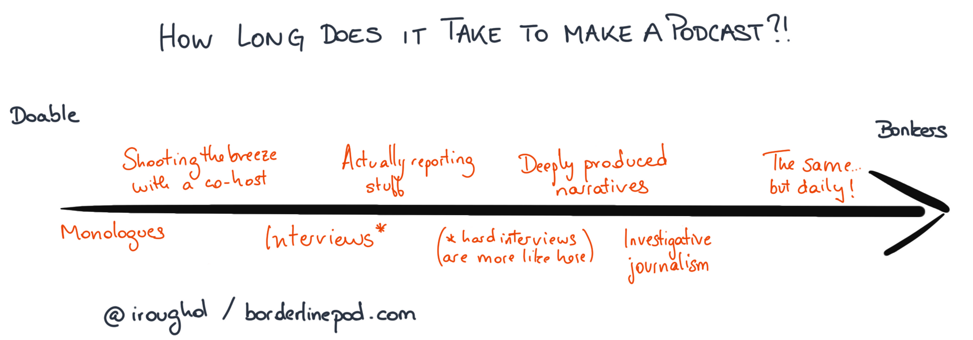 Podcasting is really just a distribution mechanism – an RSS feed for audio. Talking about it as a single industry is deceptive. Are your high school AV club and Twentieth Century Fox in the same business? Podcasts live on a scale from the simple one-man-and-his-mic rant to deeply reported, deeply scripted narratives taking whole teams months to produce. As a solo indie podcaster, you’re going to want to be on the left end of this scale. Think about the time it’ll take to find and book guests before embarking on an interview podcast. Make sure you’re not solo if you’re going to need fact-checking. Listen to a similar podcast to the one you envision for yourself, and pay attention to the credits. How many people did it take?