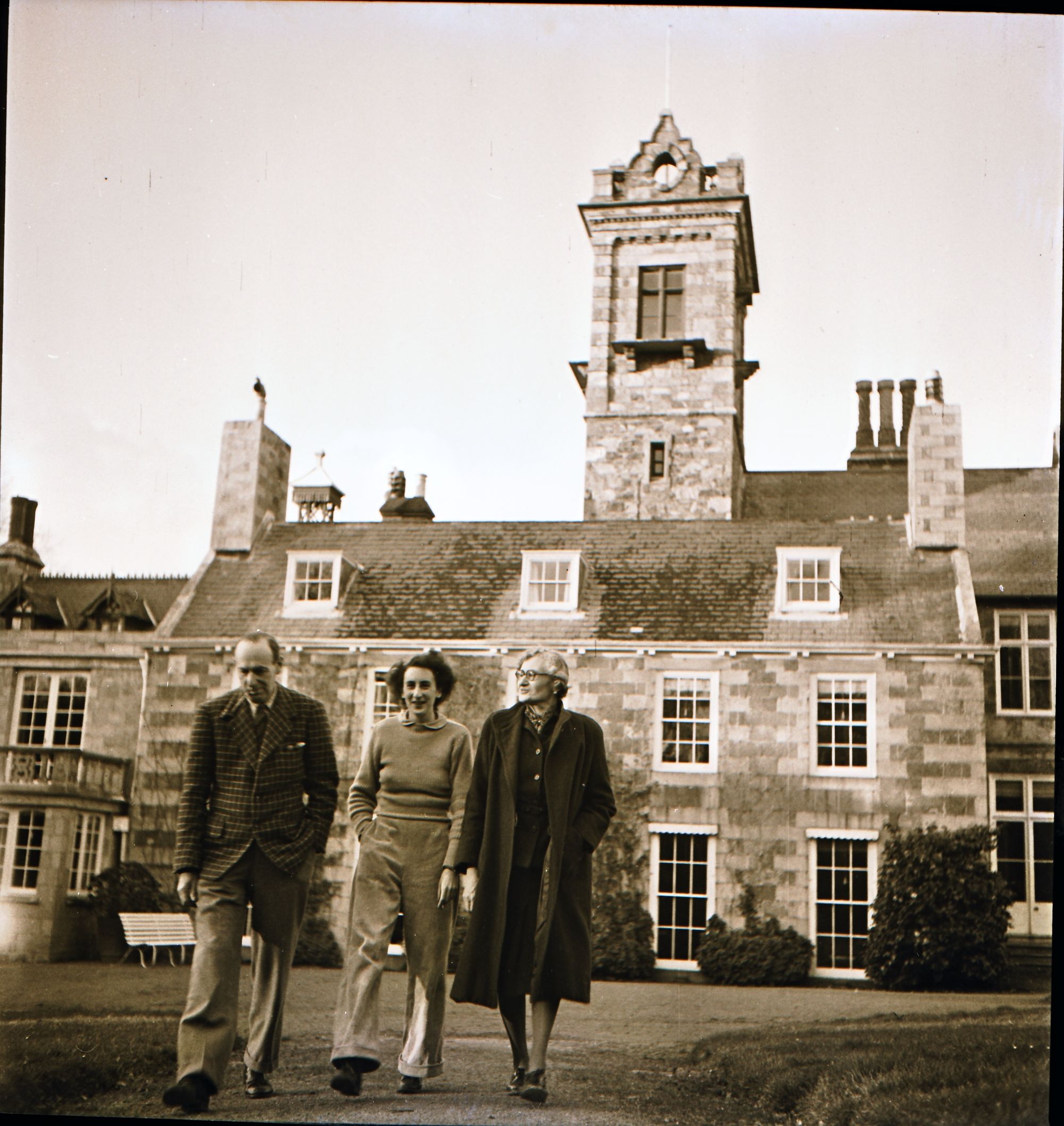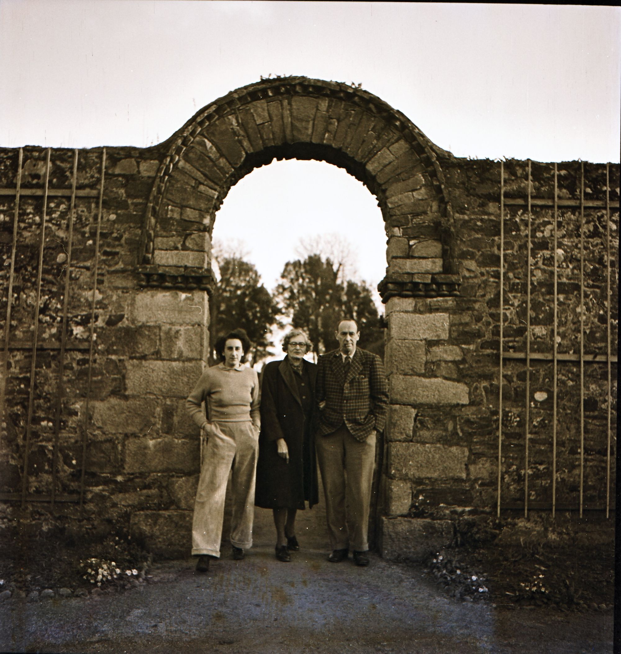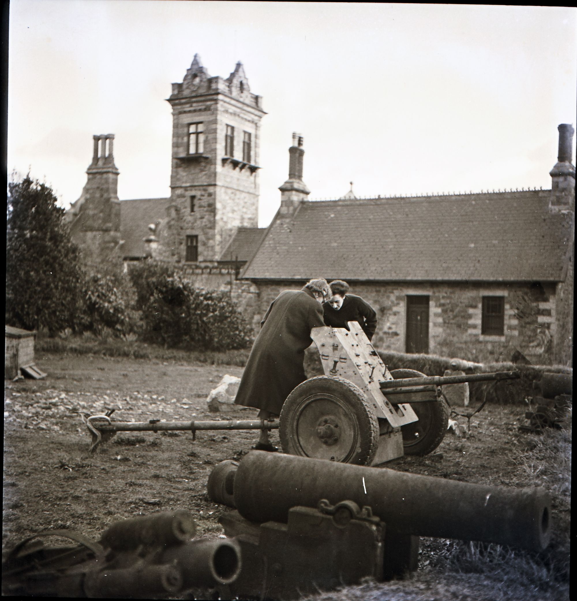 169. Back of the house on what was known as the battery. Home to a number of cannons one dating from Elizabethan times, others from the 1800s. Also a couple of German artillery pieces; Sibyl and Jehanne are looking at a small field gun, a mortar is in the foreground. This area has recently been redeveloped and is now an ornamental orchard, the cannons have been relocated to the front of the house.