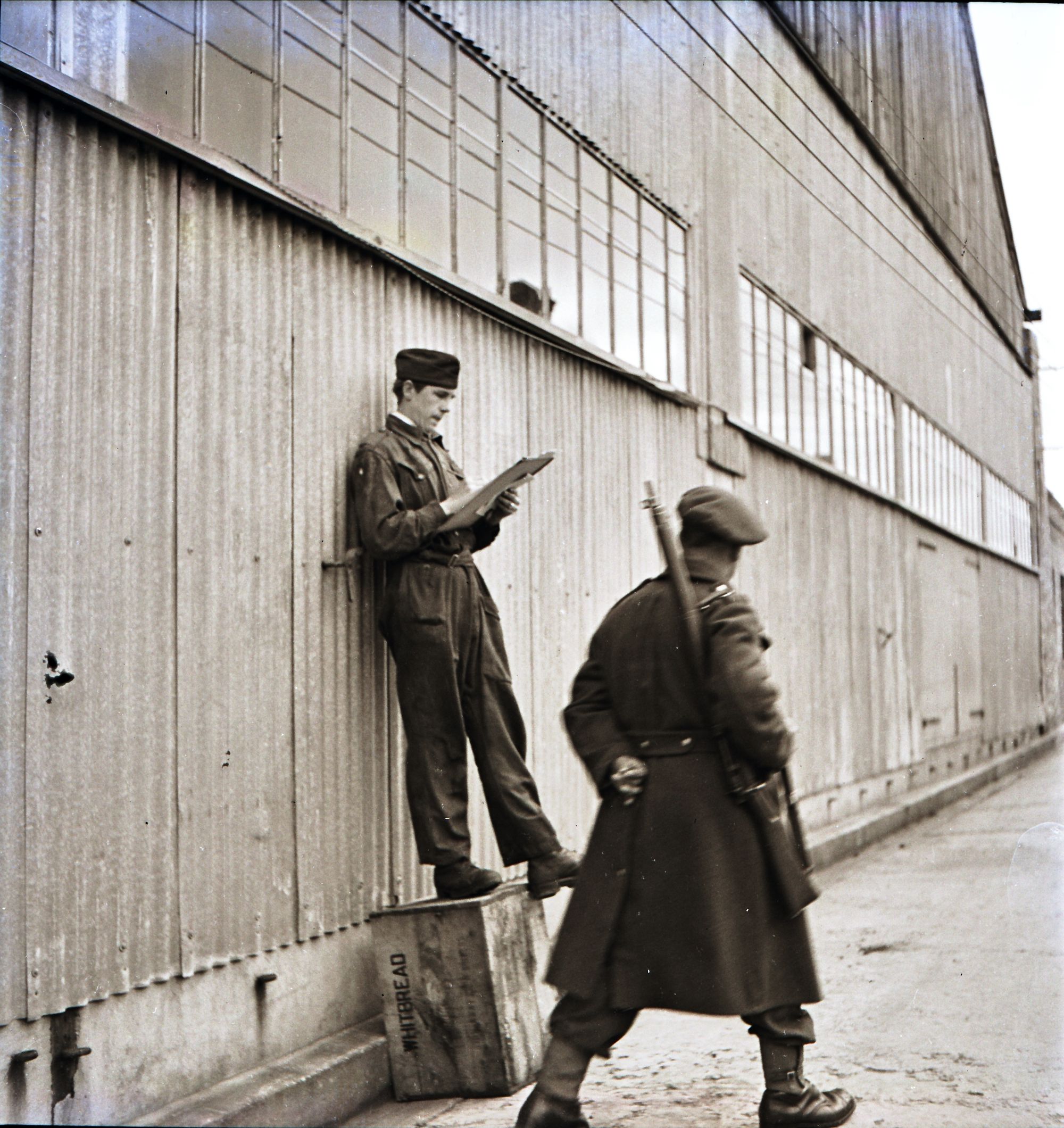84. An English sentinel keeps watch over a German prisoner "hard at work." (Une sentinelle anglaise monte la garde devant un prisonnier allemand « en plein travail »)