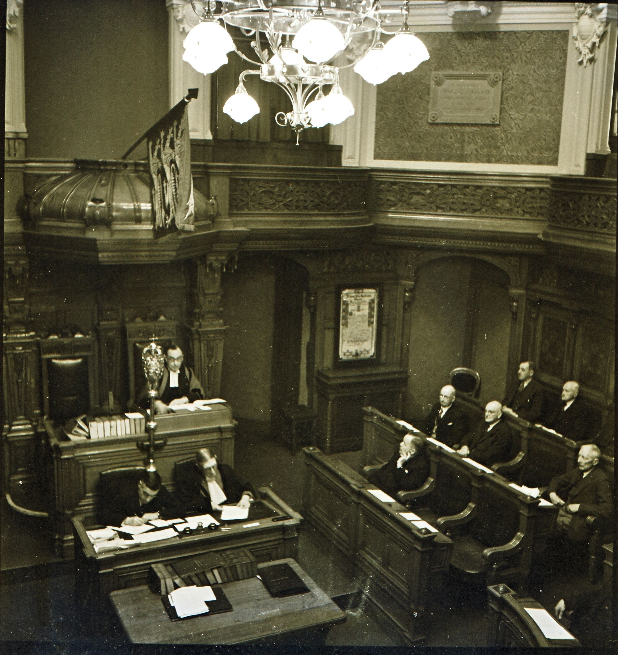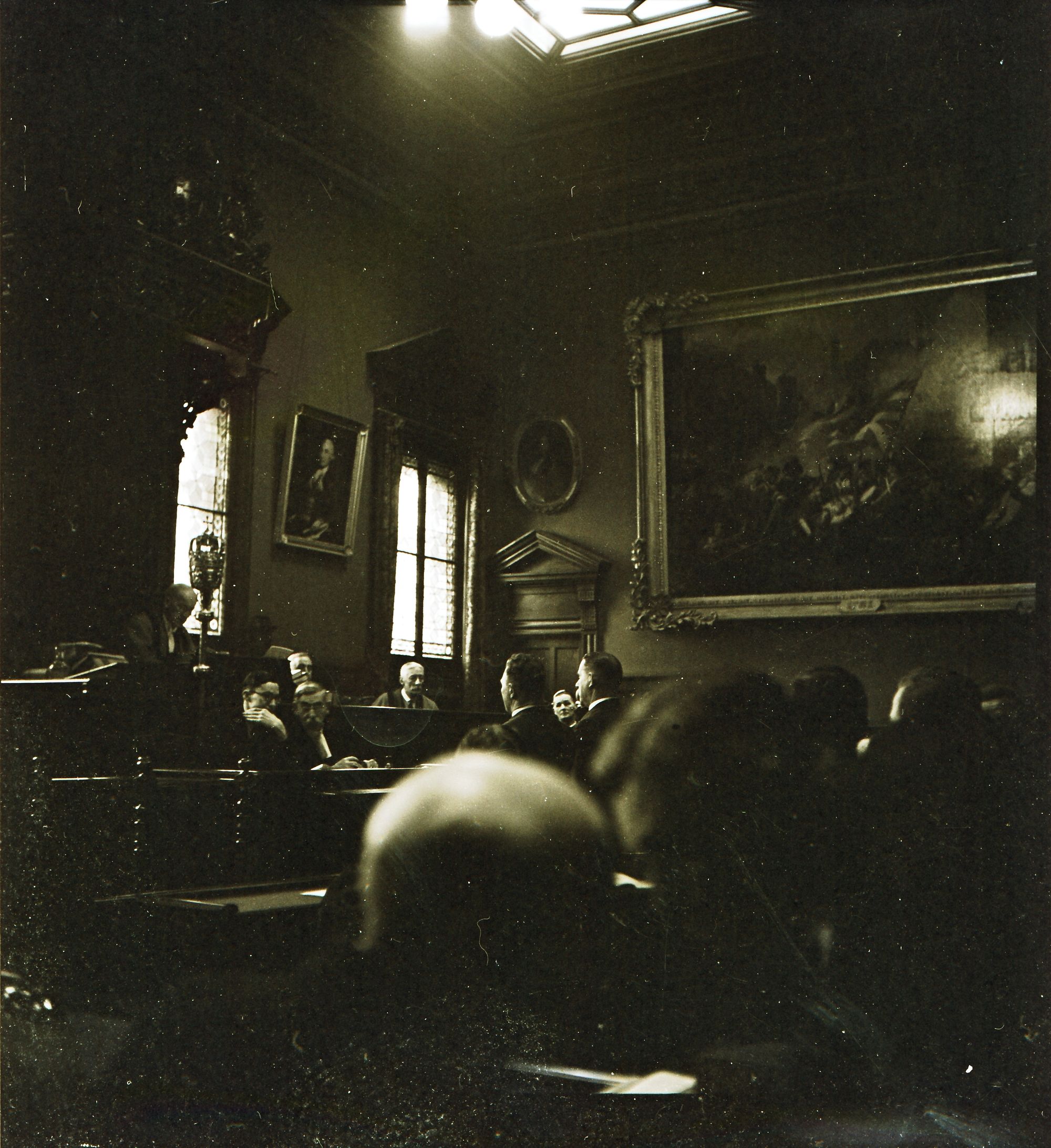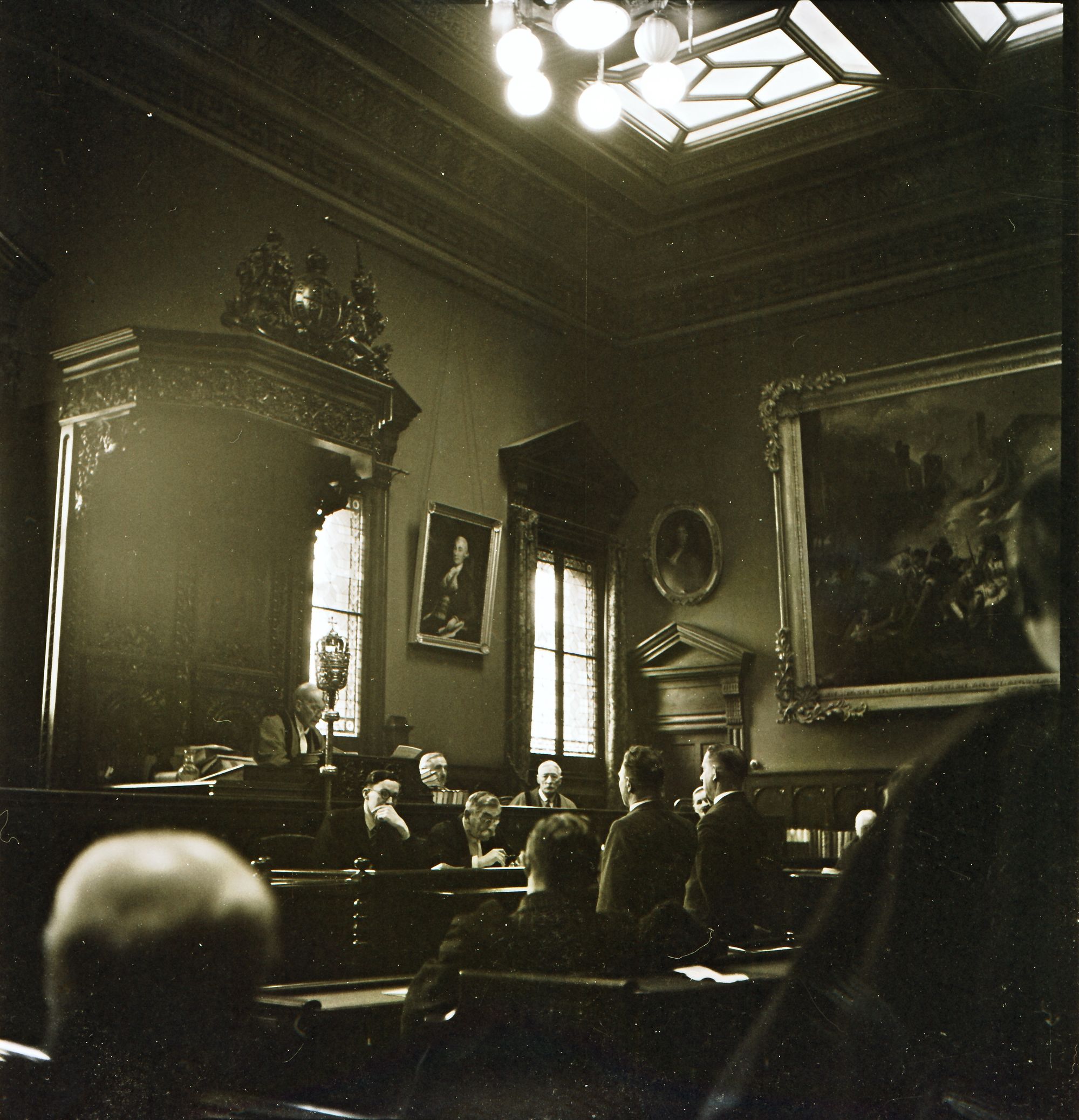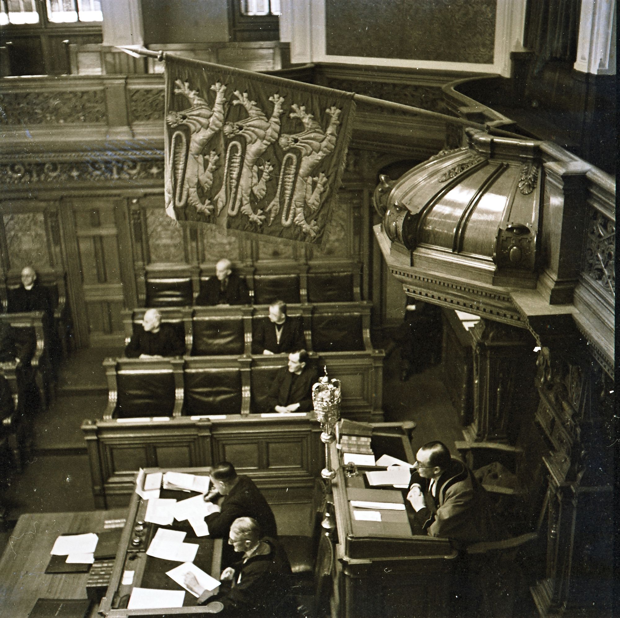 118. Mr Coutanche presides. Before him the golden royal mass dating back to 1066. Above him the three leopards flag.(Monsieur Coutanche préside. Devant lui la masse d’or royale datant de 1066. Au dessus l’étendard aux trois léopards.)