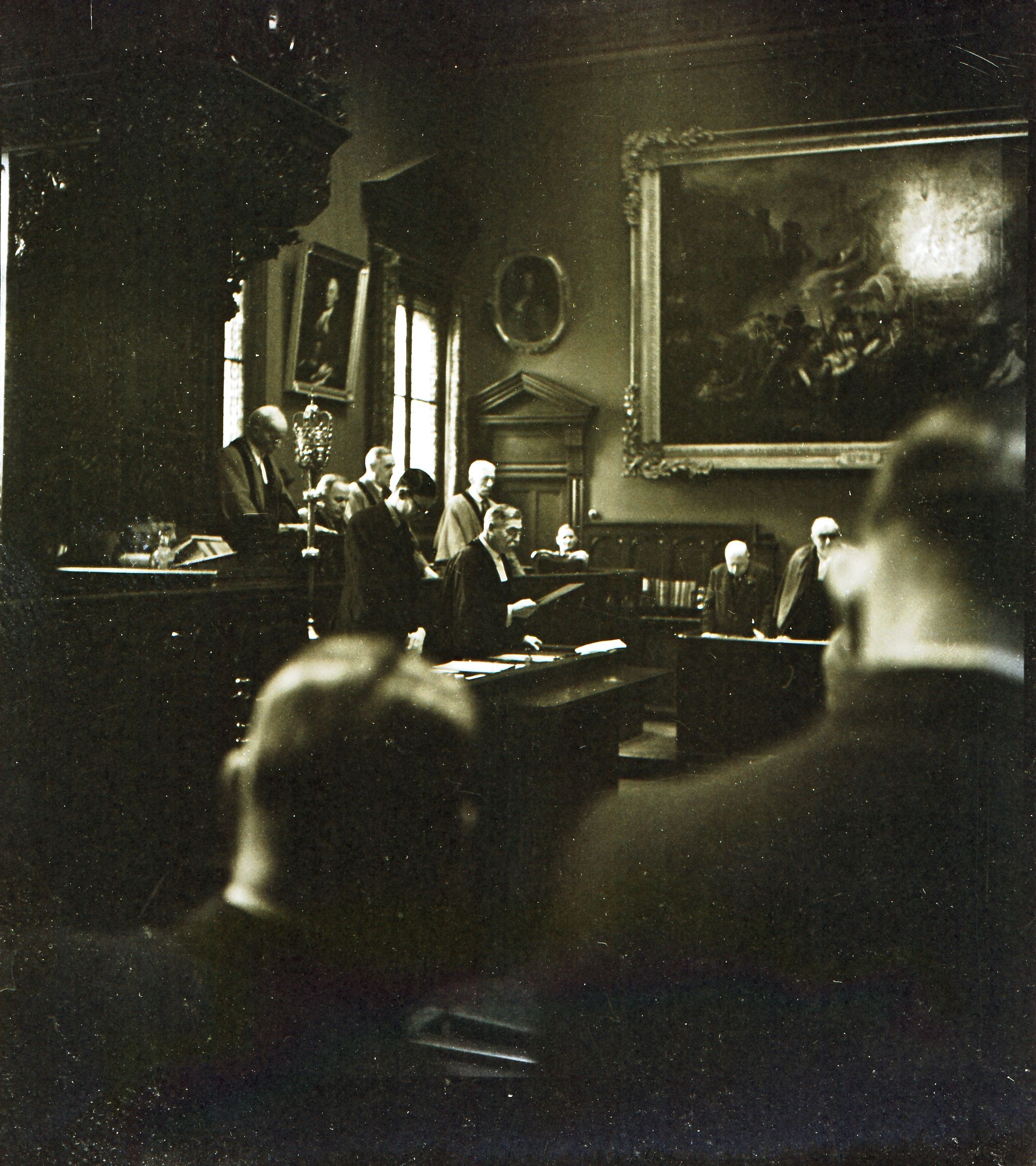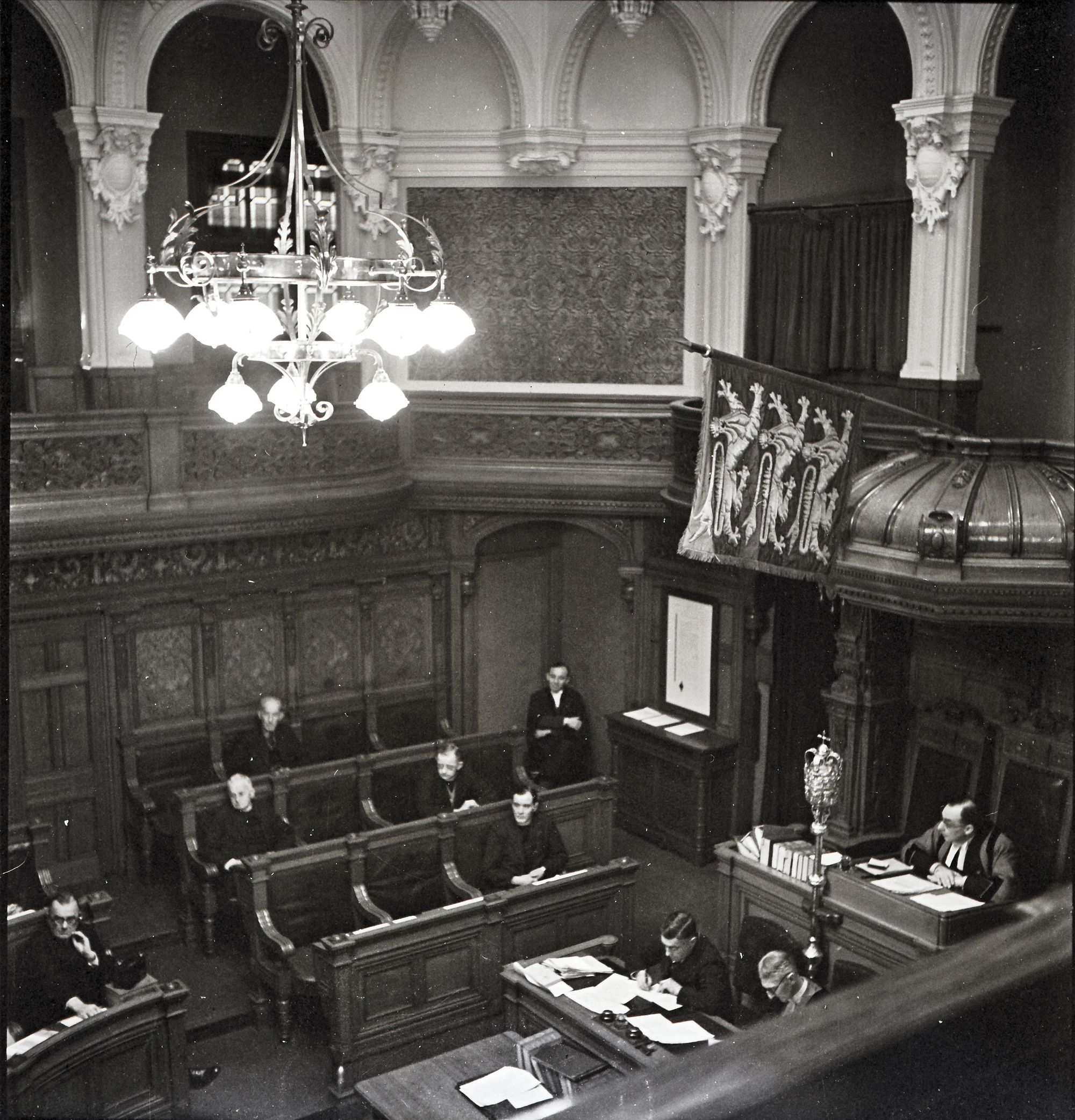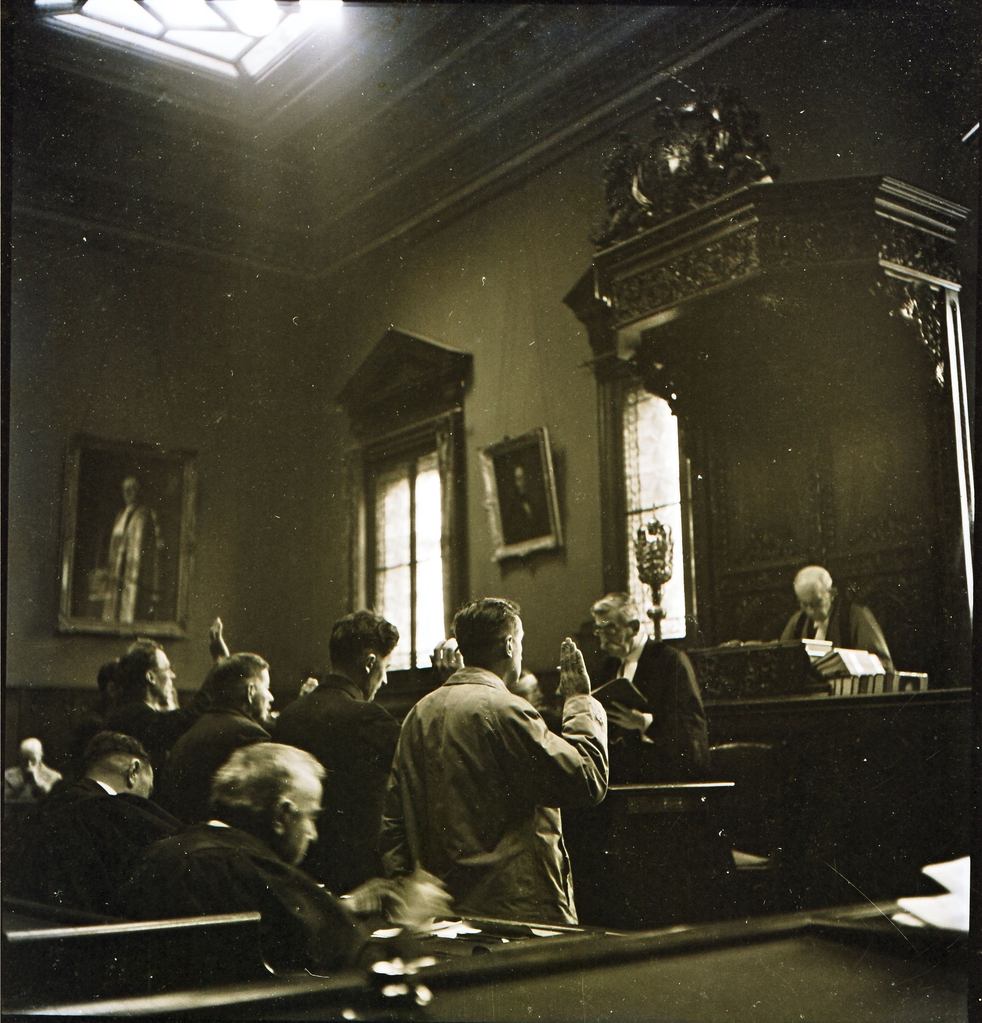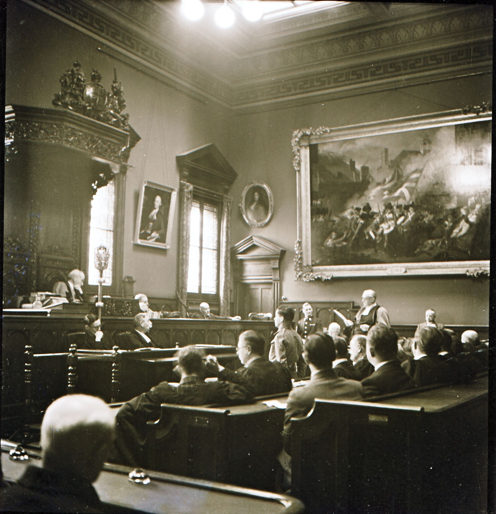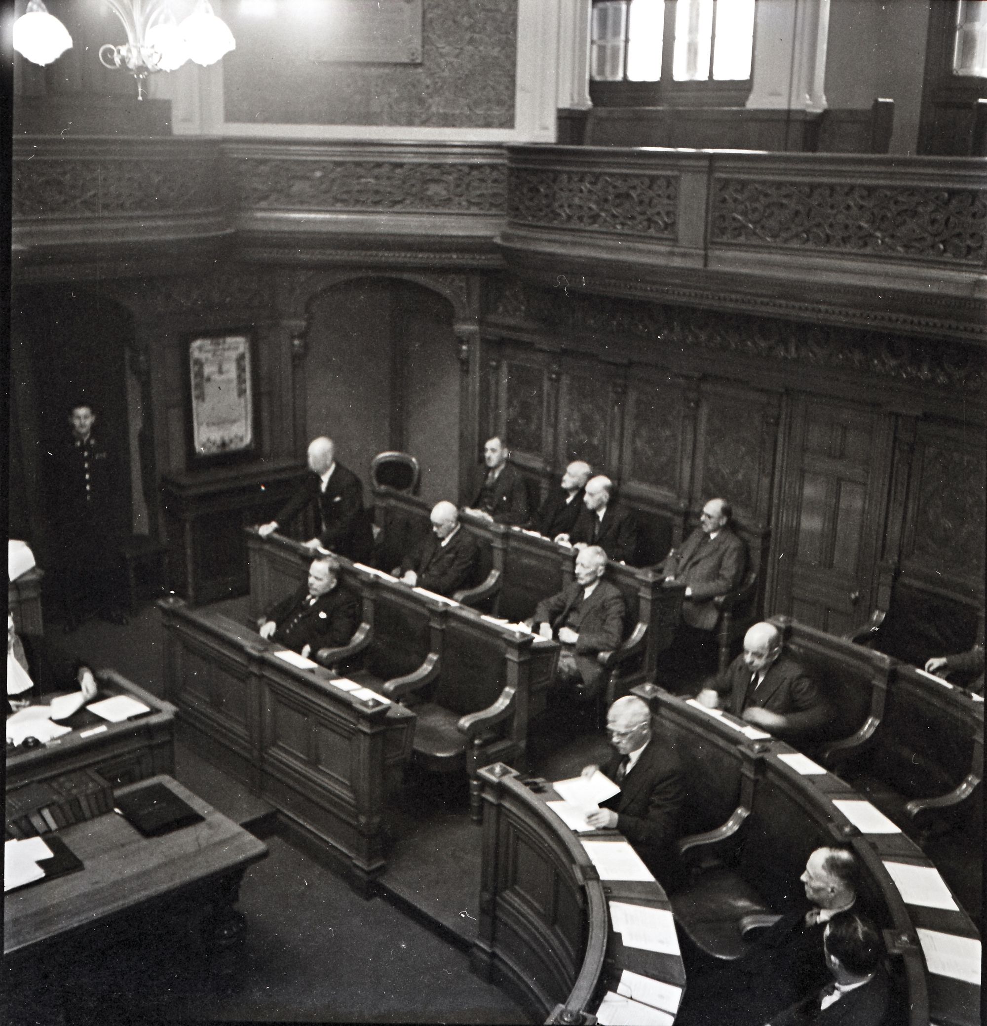 118. Mr Coutanche presides. Before him the golden royal mass dating back to 1066. Above him the three leopards flag.(Monsieur Coutanche préside. Devant lui la masse d’or royale datant de 1066. Au dessus l’étendard aux trois léopards.)