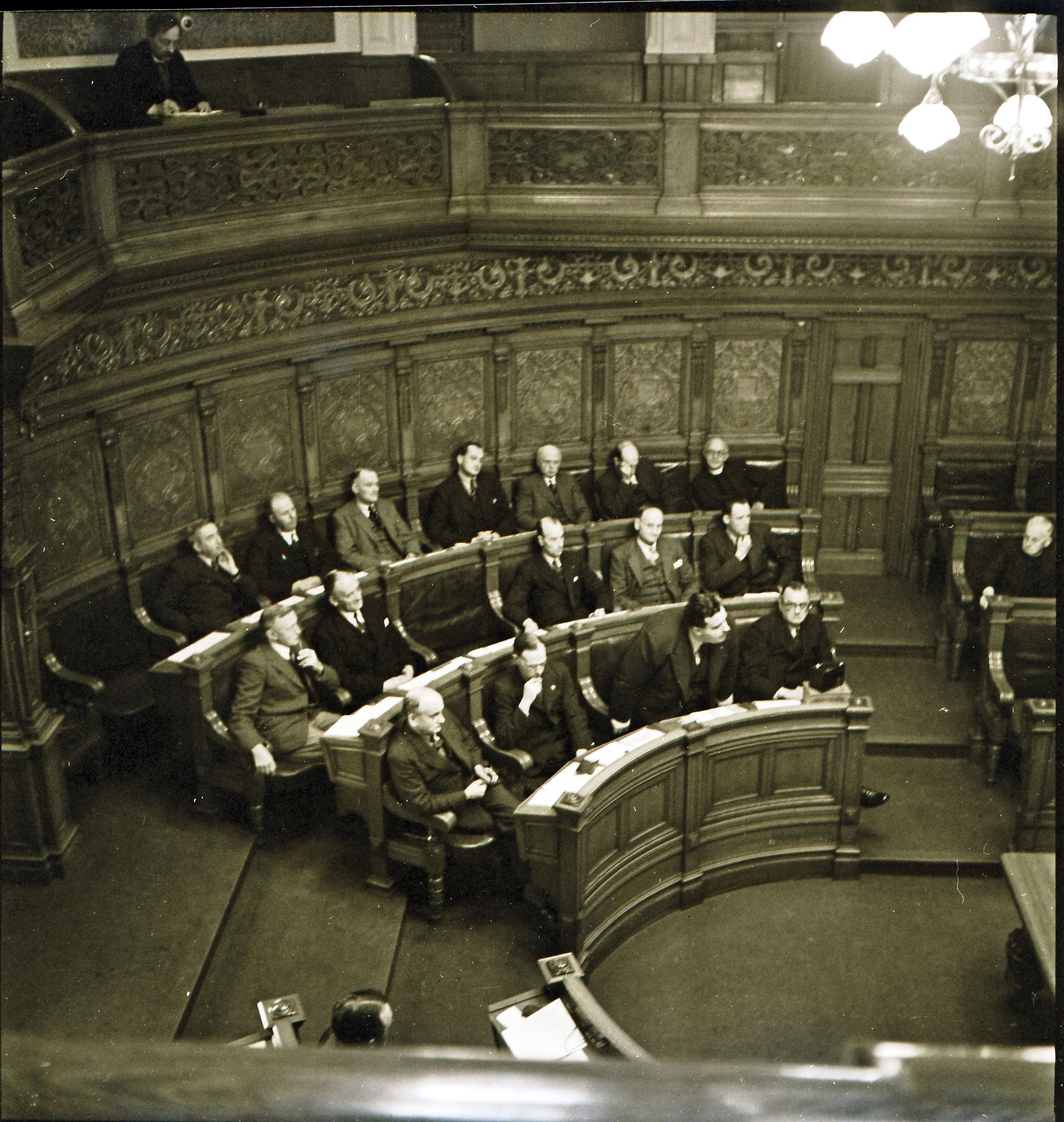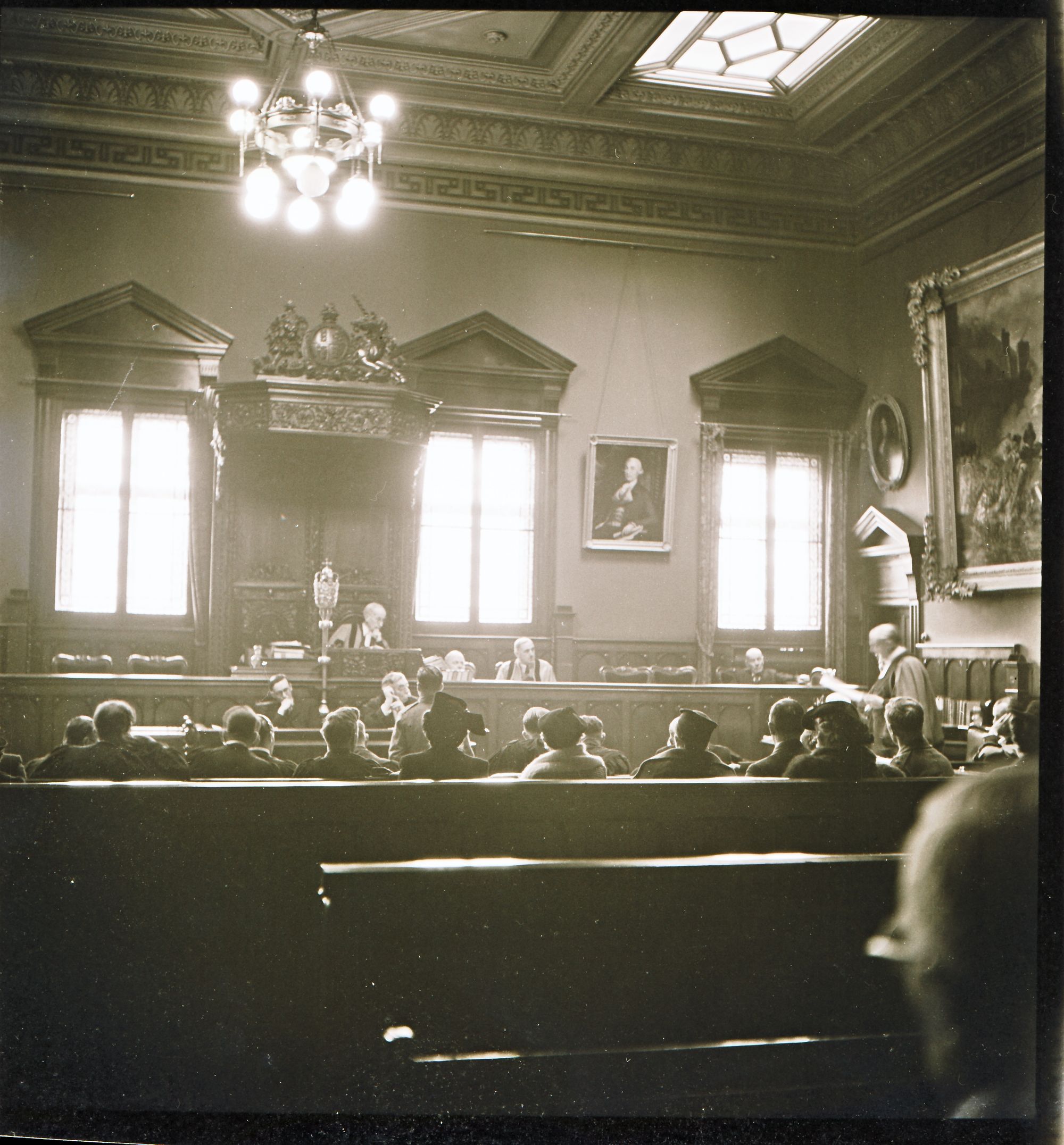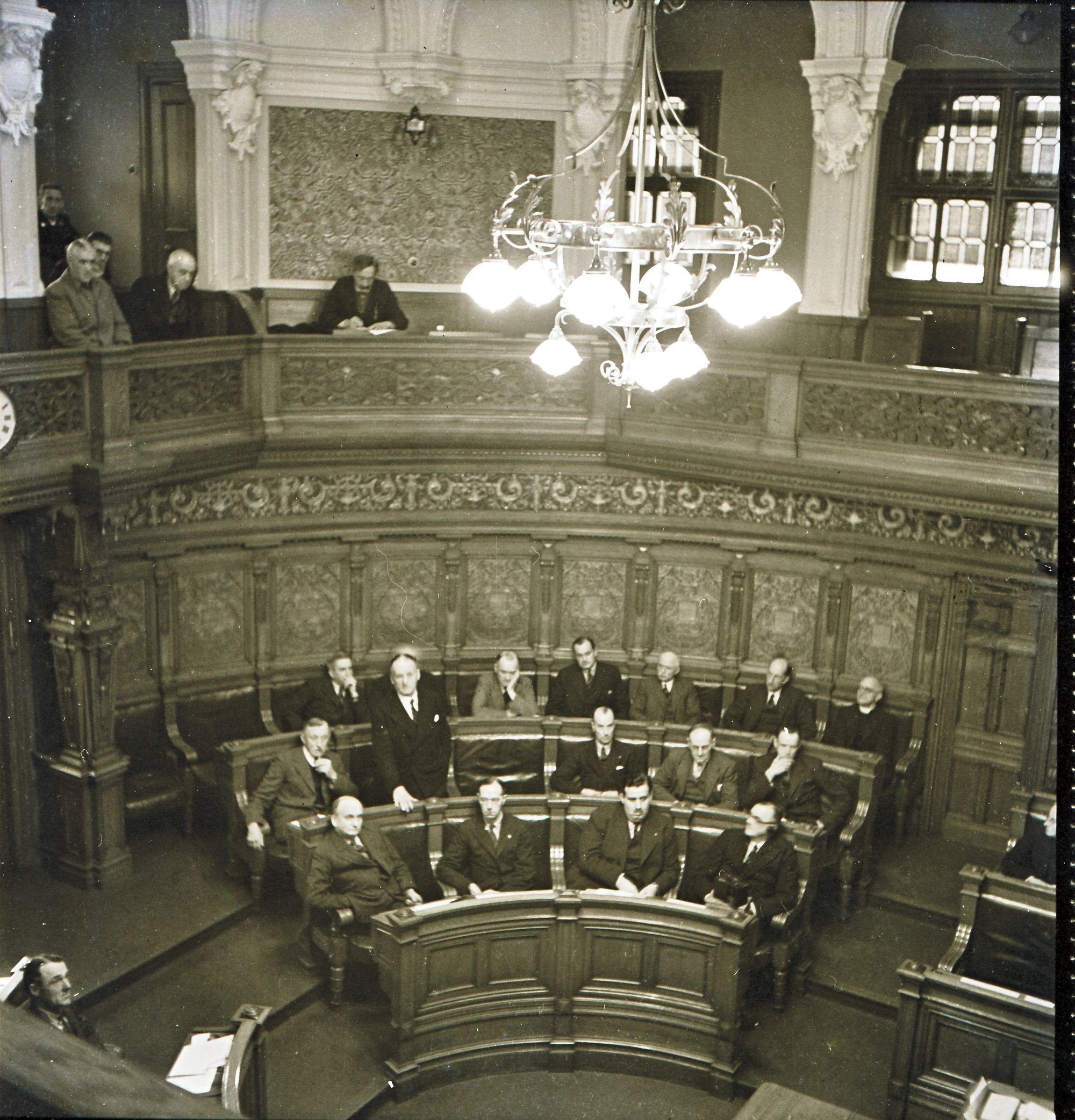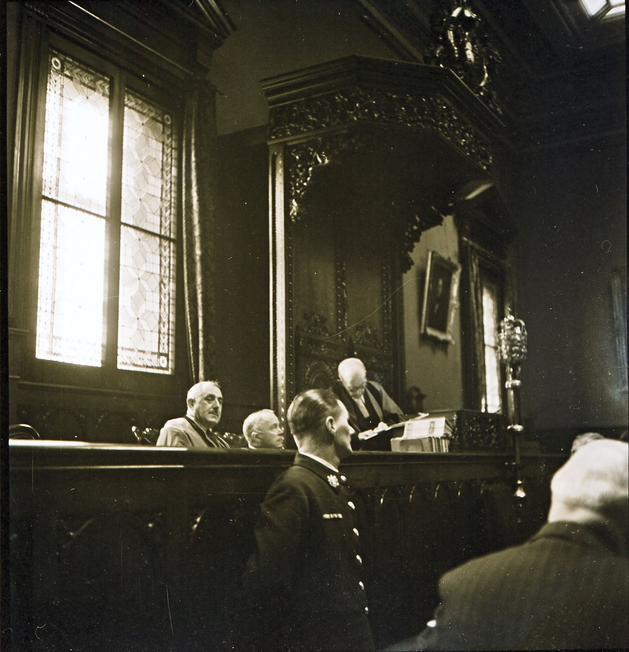 118. Mr Coutanche presides. Before him the golden royal mass dating back to 1066. Above him the three leopards flag.(Monsieur Coutanche préside. Devant lui la masse d’or royale datant de 1066. Au dessus l’étendard aux trois léopards.)