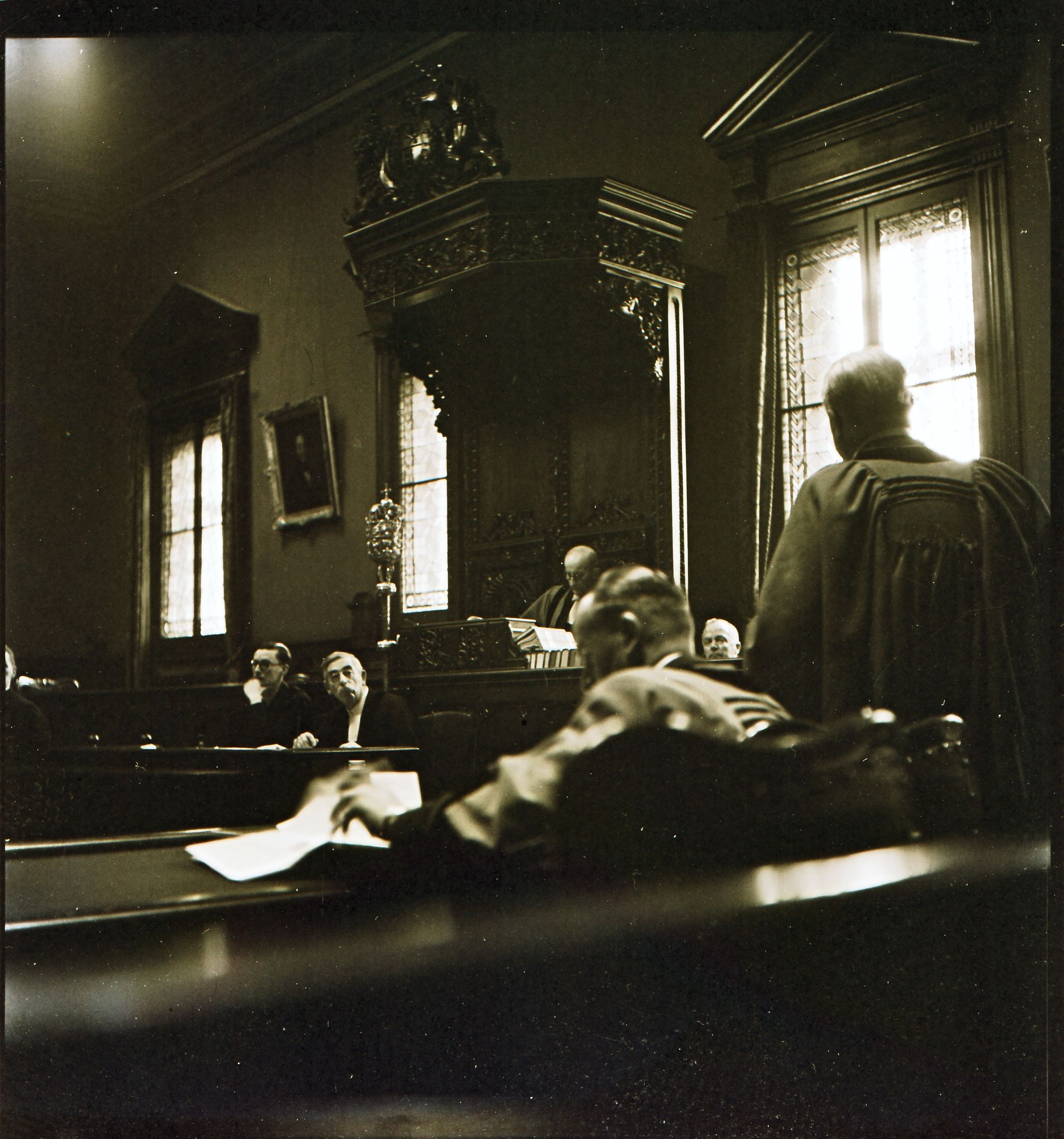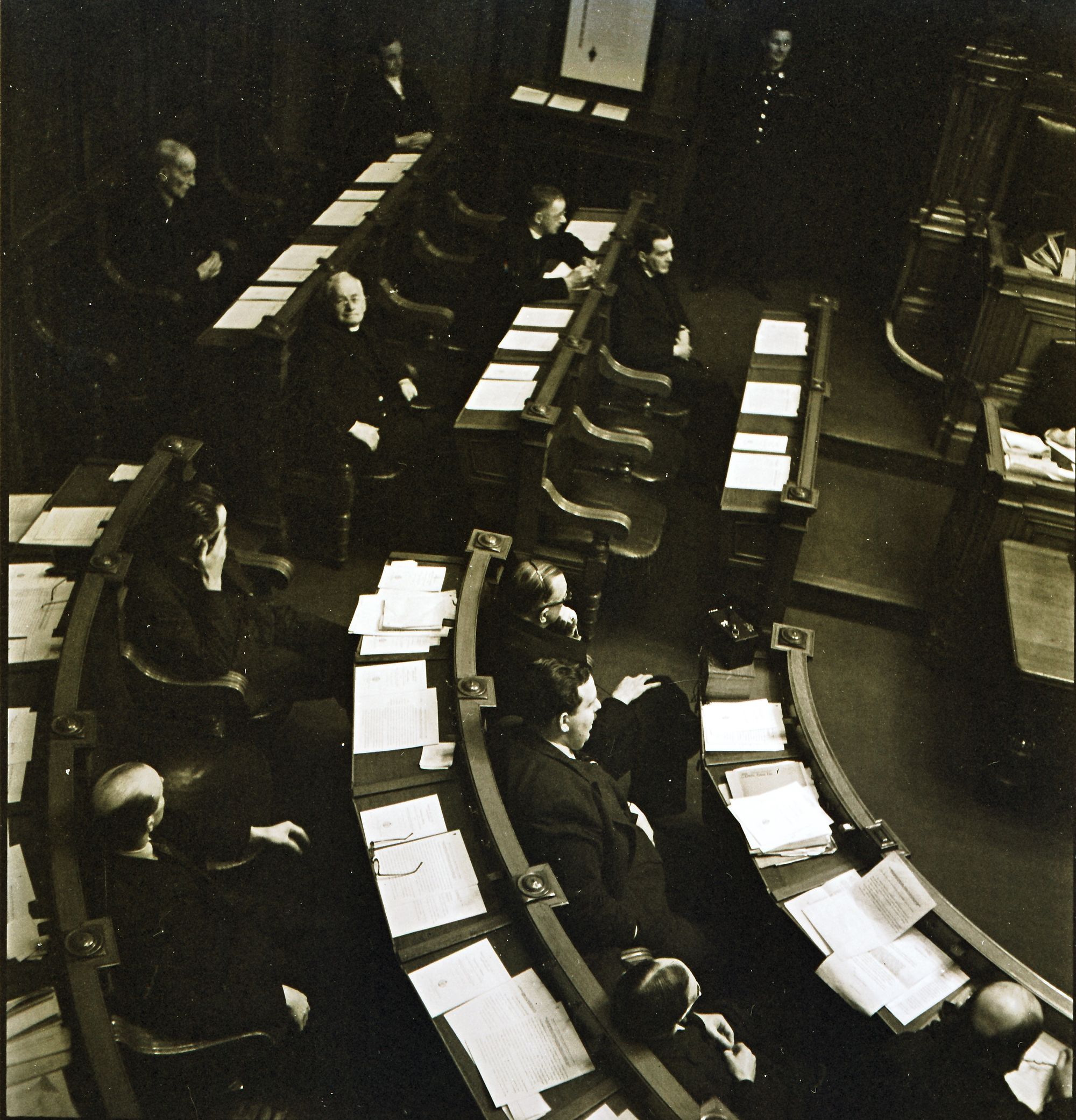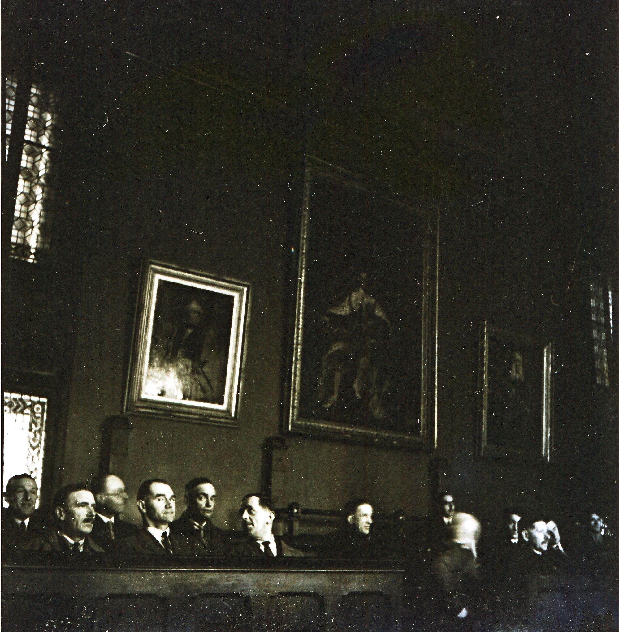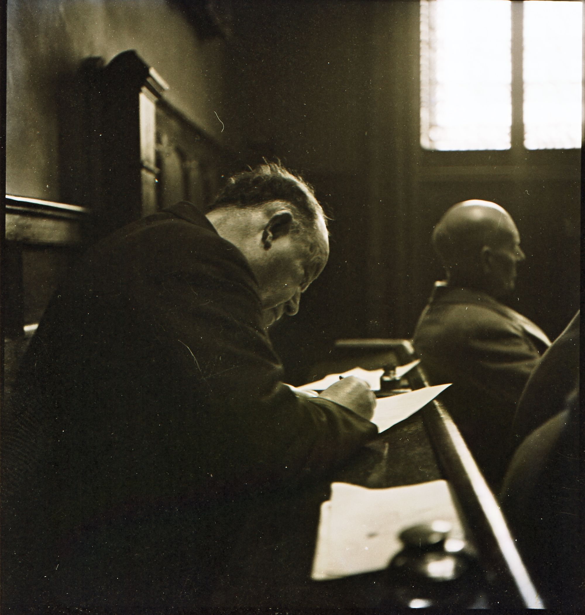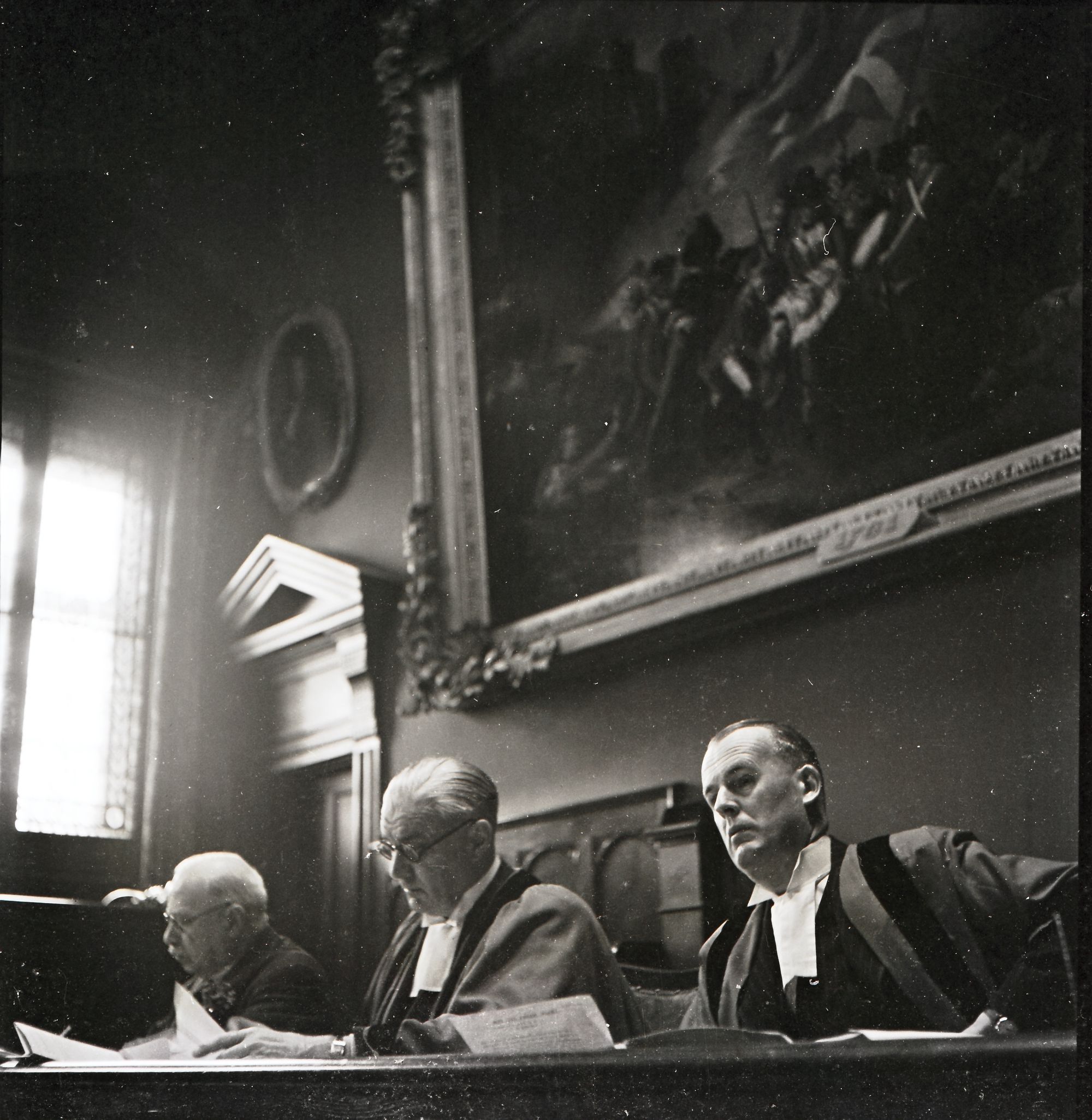 118. Mr Coutanche presides. Before him the golden royal mass dating back to 1066. Above him the three leopards flag.(Monsieur Coutanche préside. Devant lui la masse d’or royale datant de 1066. Au dessus l’étendard aux trois léopards.)