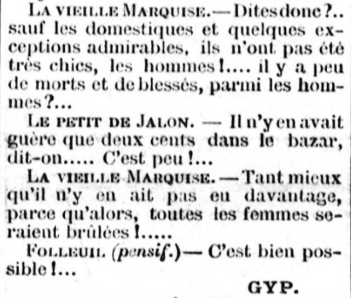 So did the behaviour of men cause more women to die at the Bazar de la Charité? There is no convincing evidence either way. Authorities chose not to investigate. The press was split and too partisan to be entirely reliable. We're not even sure how many people were at the Bazar, somewhere between 700 and 1,500. We do know the vast majority of the crowd were women. We know their clothes were impractical and highly flammable. We know the building was a death trap. We cannot discount individual acts of panic.