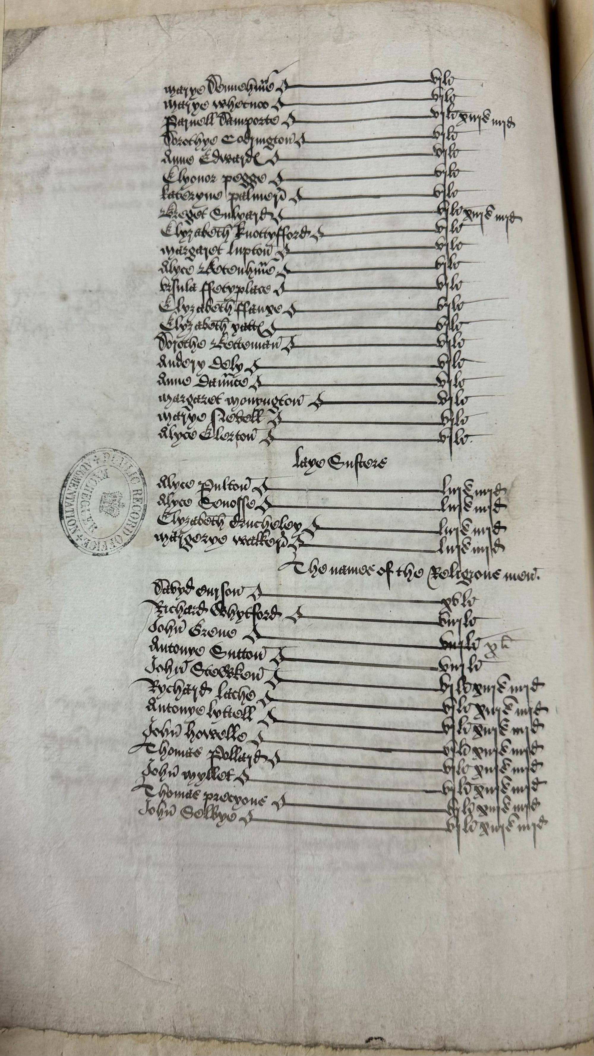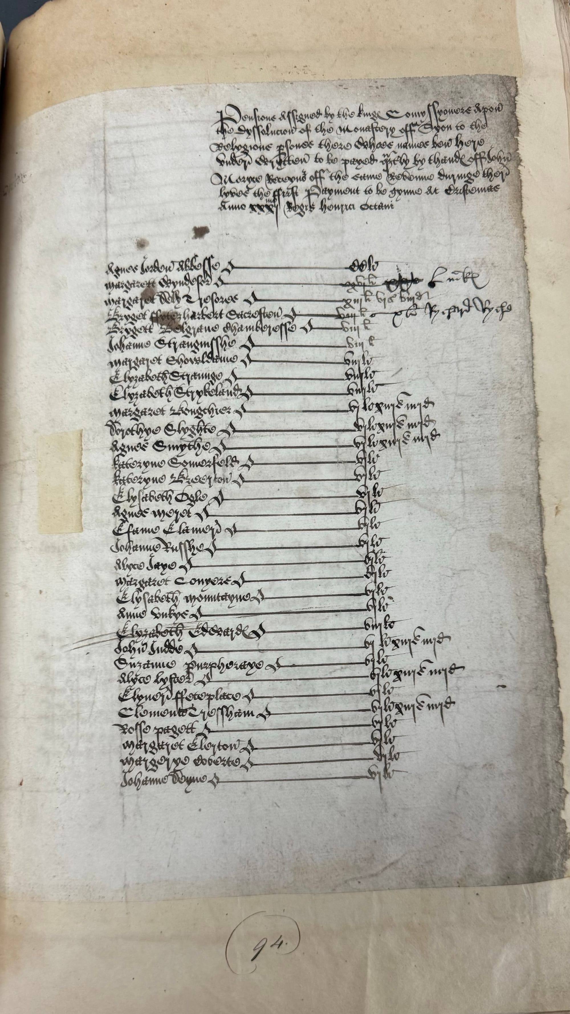 The warrant of pensions of Syon Abbey, a mixed house west of London. Yes, reading it takes some practice. Men and women appear to have been treated equally according to seniority, not gender. (National Archives, E315_245_94)