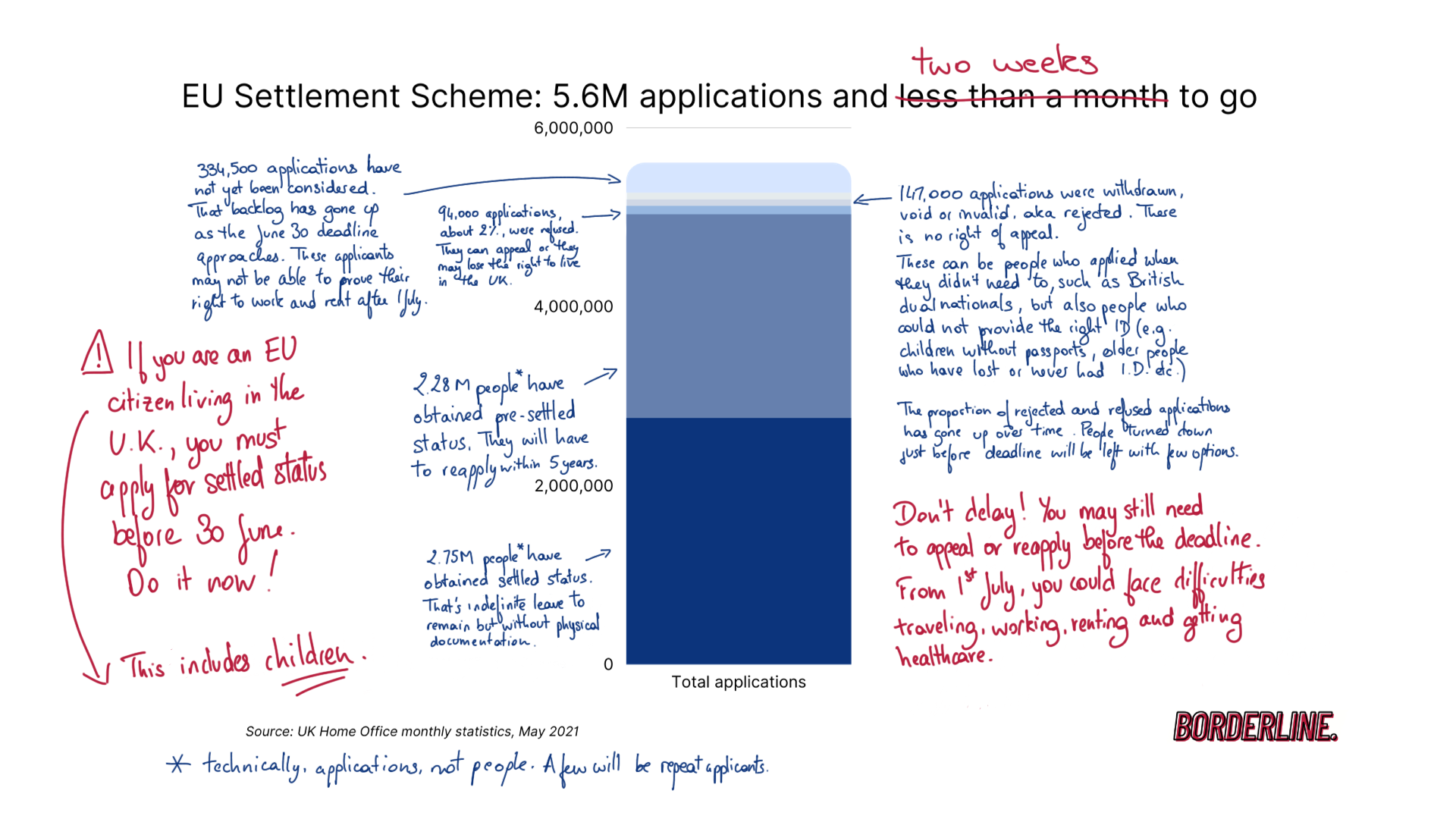 πͺπΊ There's only two weeks left to apply for the EU Settlement Scheme in the UK, as well as for British citizens living in France, Malta, Luxembourg and Latvia to secure their post-Brexit rights. People know by now, you'd think. But yesterday in a Facebook group, I came across a woman who thought she was covered by an old permanent residency card and only found out she and her two children needed to apply for settled status asap. The devil is in the fine print. If you are or know an EU citizen living in the UK, or someone who might be, especially if they are a child, in care or somehow vulnerable, be kind and have a polite check in with them. Β They can apply here. There are very few cases where people don't need to apply, and you're better off applying for nothing than the reverse. There will be little recourse after 30 June. Here's where we stand.